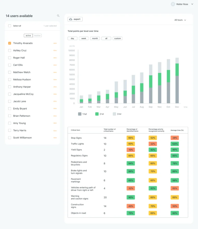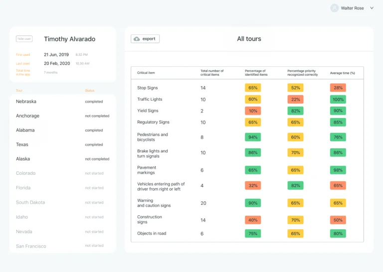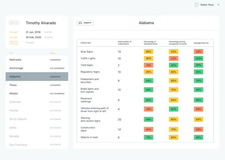 Drive Focus User Analytics is a browser-based tool designed for driving schools, occupational and speech therapists, researchers. User Analytics allows these customers to view detailed usage and performance information about their clients.